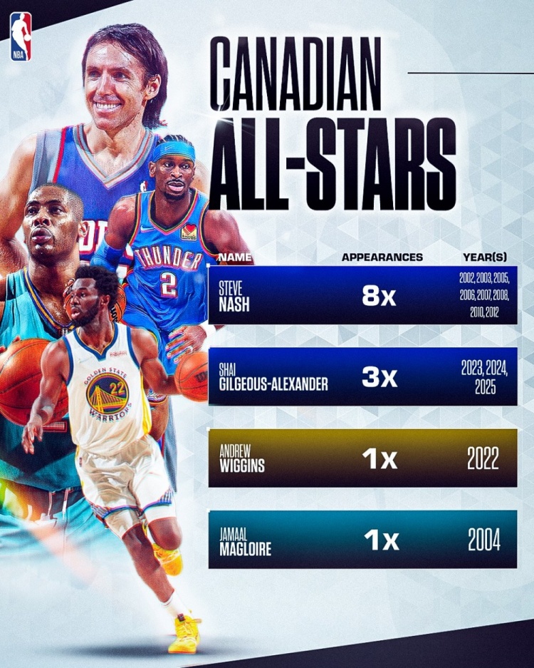 1月15日讯 NBA Canada晒出了历史上入选过全明星的加拿大球员。历史上,他们一共只有4人入选过全明星,分别是:纳什(8次)、亚历山大(3次)、维金斯和马格洛伊尔各1次。...